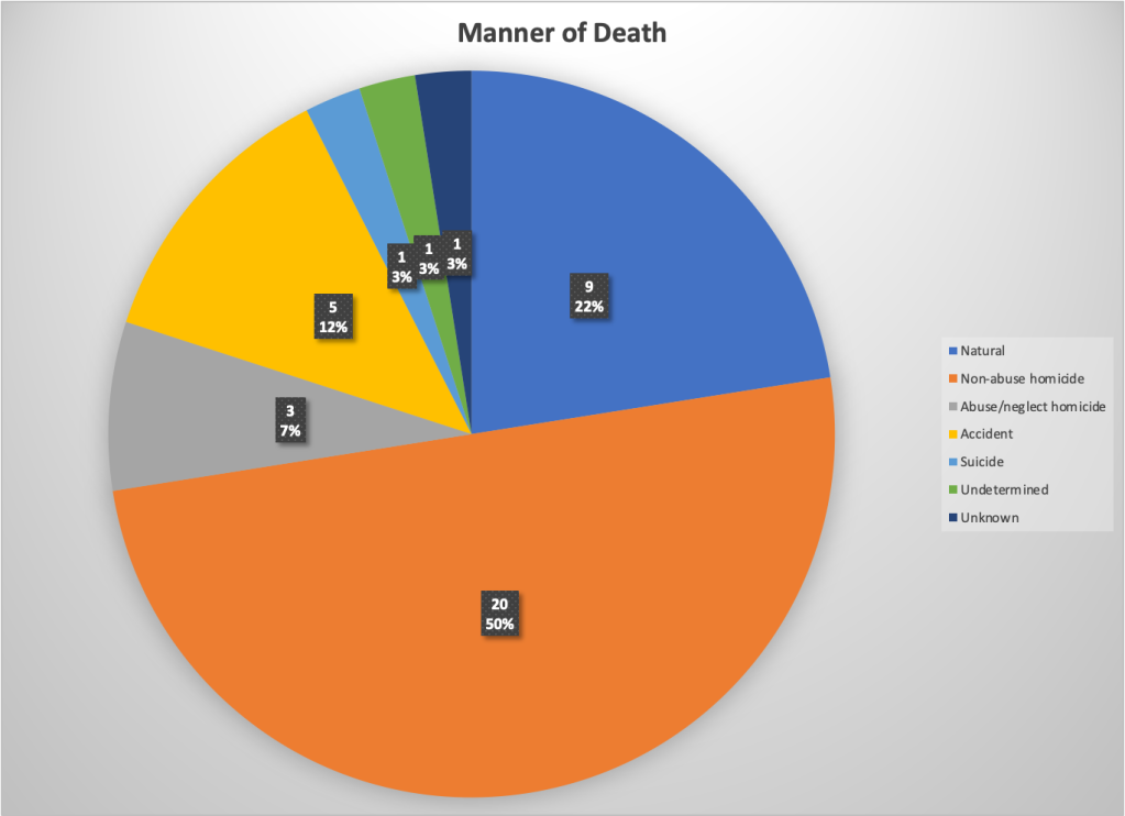 The manners of death* of the 40 children whose cases are included in the body of the report are displayed in the pie chart below. Half of these children were victims of “non-abuse homicide;” nine (or 22 percent) died of natural causes; five (or 12 percent) died in accidents; three (or seven percent) died because of abuse or neglect; and one died by suicide. The other two children’s manners of death were “undetermined” and “unknown.” While children who die from abuse and neglect after having previous contact with child welfare draw the most public concern, research shows that children who have prior contact with child welfare also tend to die more often from all causes than children with no such involvement, as I discussed in my post, Report of maltreatment: a major risk factor for child mortality.