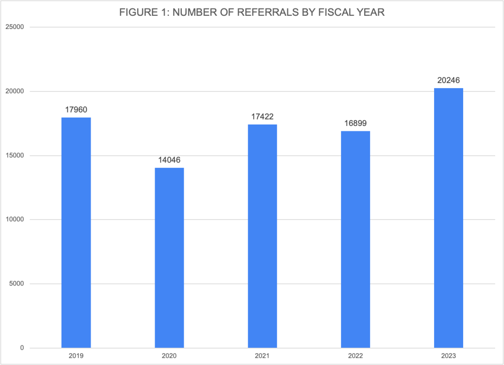 Figure 1 shows the precipitous drop in referrals during the pandemic year of 2020, followed by an increase in FY2021, and a slight dip in FY2022. The total of 20,246 calls to the hotline in FY2023 was 20 percent above the total of 16,899 in FY2022 and even eclipsed that of the year before the pandemic. Most sources increased their reporting in FY2023, but much of the increase came from school and childcare personnel, who made 10,329 reports in FY2023 compared to 8,389 in FY2022. It is not clear why referrals increased so much in FY2023.