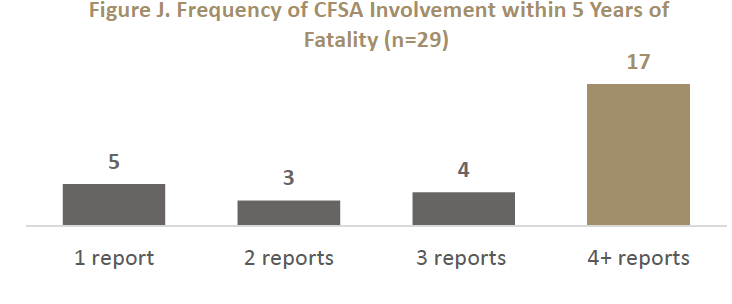 The chart below shows the frequency of CFSA involvement for the families with fatalities. All of the families had more than one report to CPS within five years of the fatality, 31 families, or 77 percent of the families, had four or more reports. So these families were very troubled, and there were many opportunities for CFSA to intervene.