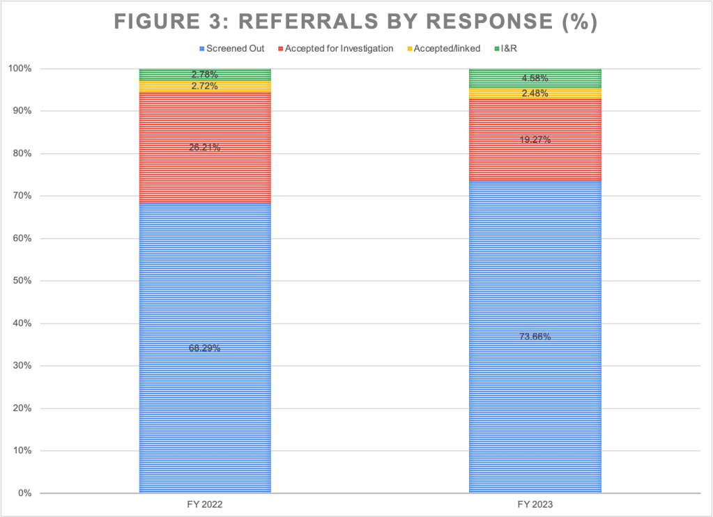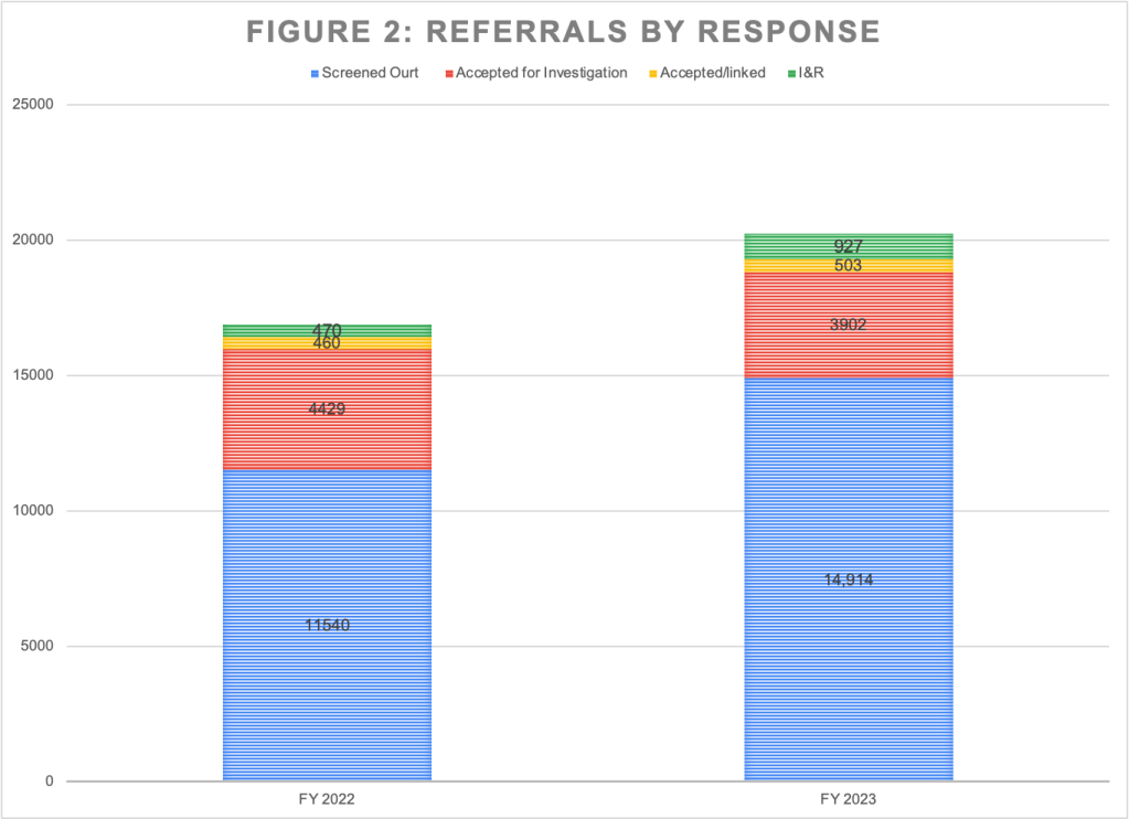 *While the number of referrals accepted for investigation was 3,902 in FY2023 according to the Dashboard’s Hotline Calls by Referral Type graphic, the total number of investigations displayed in the Investigations by Disposition graphic was 3,704. The reason for the difference is unclear. According to the Dashboard, “accepted for investigation” means that “the hotline call resulted in a new investigation being opened on the family.” So the two numbers should be the same.