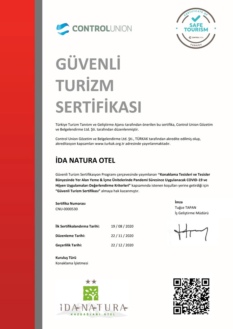 Türkiye Turizm Tanıtım ve Geliştirme Ajansı tarafından önerilen bu sertifika, Control Union Gözetim ve Belgelendirme Ltd. Şti. tarafından düzenlenmiştir.